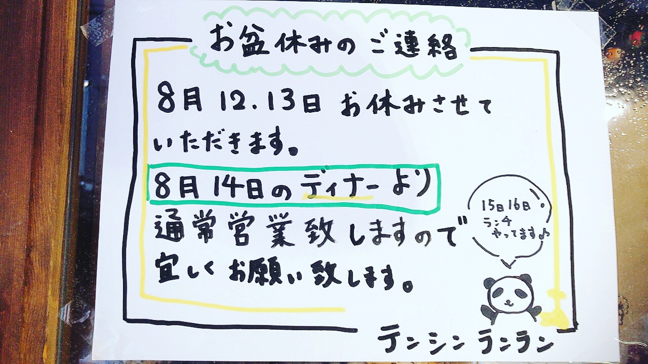 テンシンランランのお盆明けの営業についてのお知らせです📢📢